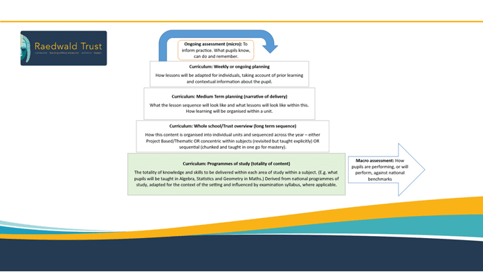 The Raedwald Trust curriculum is derived directly from the National Curriculum for all Key Stages. Programmes of study span from the Early Years to Year 11 and these identify the small steps that are required for pupils to secure knowledge appropriate to their YG, this is then translated into Curriculum Overviews where these steps are mapped across units of work. This is then used to shape weekly/daily planning which is written using the structure of the EDI framework. Policies are in place for all subjects across all pathways which identify what areas have been included and if/when any aspect if this has been consciously omitted.